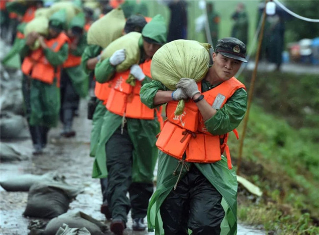 和平年代,面對波濤洶涌的洪水,解放軍官兵、民兵、消防救援人員緊急搶險救災。老百姓則紛紛走出家門,給搶險救災人員送去食物,送去溫暖: