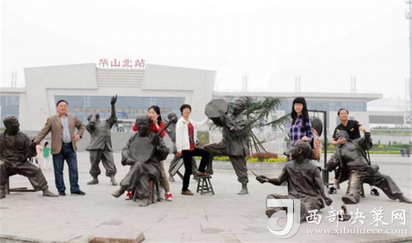 華山北站廣場(chǎng)上的老腔雕塑,老腔是陜西省非常古老的漢族戲曲表演形式,長(zhǎng)期在華陰廣泛流傳,分老腔、時(shí)腔兩個(gè)劇種,表演方法和全國大致相同,先搭好臺(tái)子、撐好"亮子",然后借助燈火,以竹簽挑撥用皮革雕成的人物進(jìn)行舞臺(tái)表演。流傳千年的老腔是中國首批國家級(jí)非物質(zhì)遺產(chǎn)保護(hù)項(xiàng)目。
