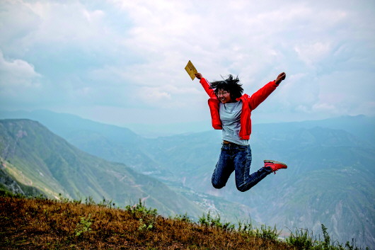 今年高考理科644分的會(huì)澤縣考生范天蘭,拿著通知書(shū)開(kāi)心得蹦起來(lái)。(9月8日攝)記者江文耀攝