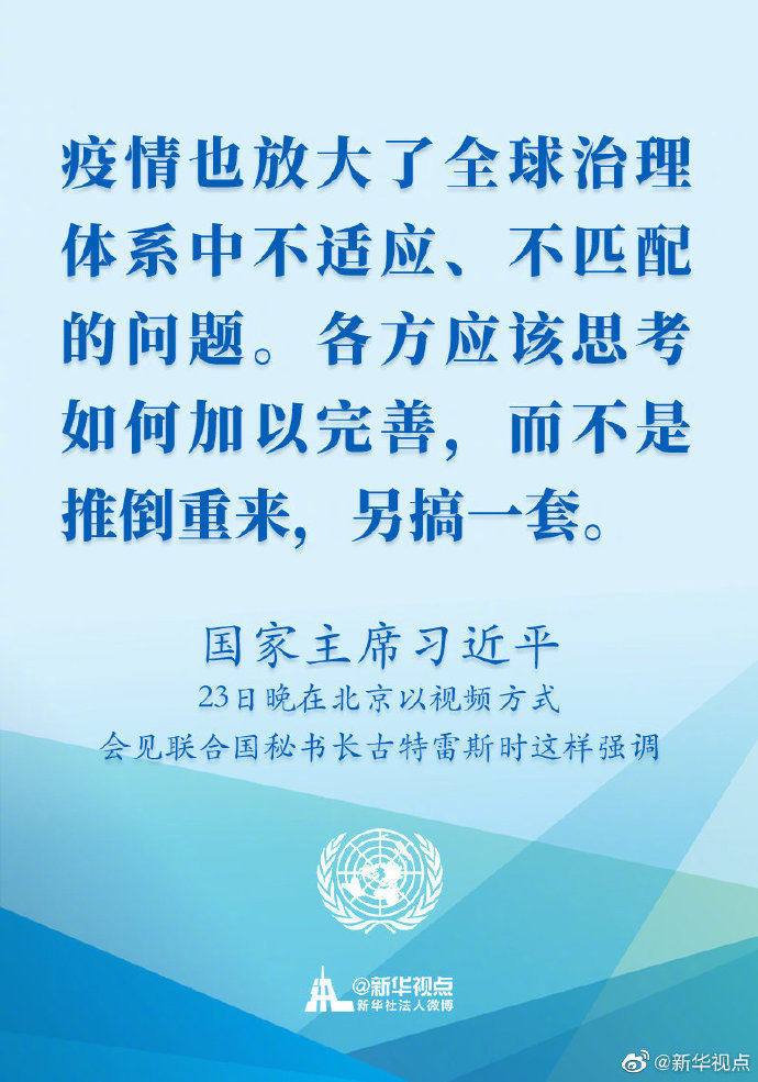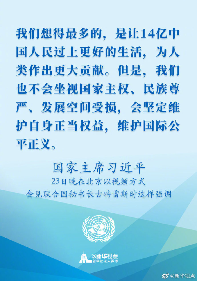 國家主席習(xí)近平23日晚在北京以視頻方式會(huì)見聯(lián)合國秘書長(zhǎng)古特雷斯時(shí)講話的金句