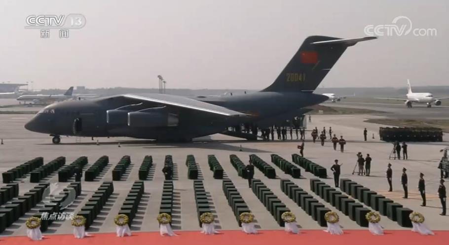 27日11點(diǎn)18分, 載有117位在韓志愿軍烈士遺骸的中國空軍運(yùn)-20專機(jī)降落在沈陽桃仙國際機(jī)場。機(jī)場用 “過水門”迎接祖國的英雄兒女回家,這是航空界最高級別禮儀。兩架中國空軍殲11—B戰(zhàn)機(jī)低空拉煙通場,向英雄致敬。