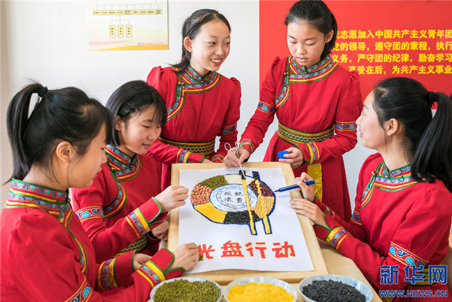 15日,內蒙古呼和浩特市第二十六中學學生展示“光盤行動”趣味糧食貼畫。新華網(wǎng)發(fā)(丁根厚攝)
