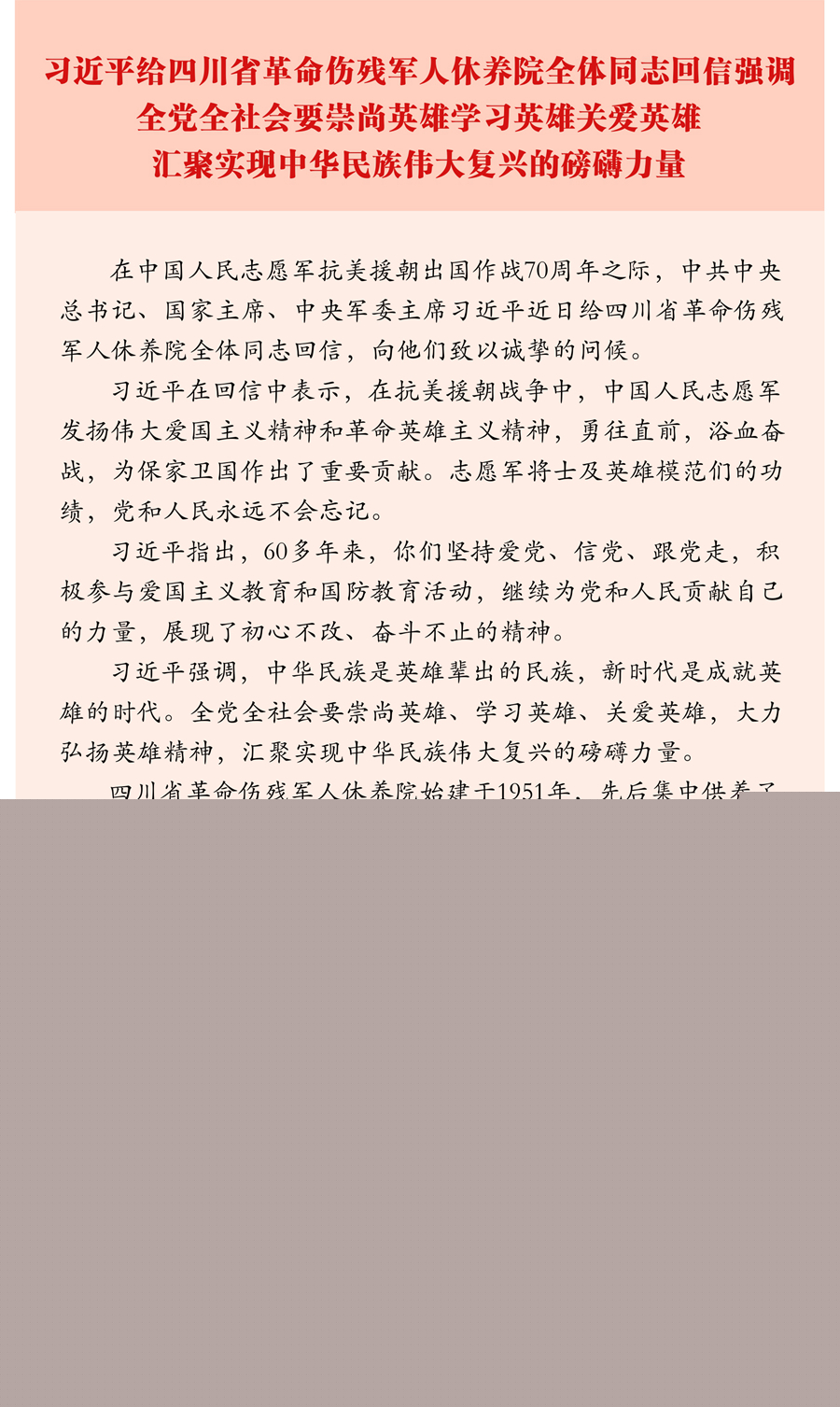 在中國(guó)人民志愿軍抗美援朝出國(guó)作戰(zhàn)70周年之際,中共中央總書記、國(guó)家主席、中央軍委主席習(xí)近平近日給四川省革命傷殘軍人休養(yǎng)院全體同志回信,向他們致以誠(chéng)摯的問(wèn)候。