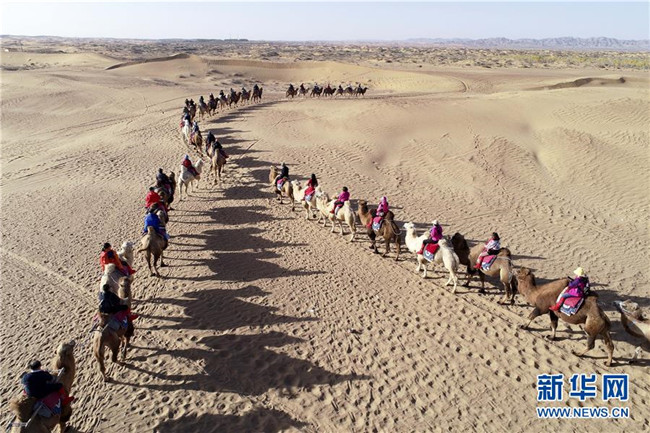 10月21日,游客在阿拉善通湖草原旅游區(qū)體驗沙漠乘駱駝旅游項目(無人機照片)。 新華社發(fā)(王正 攝)