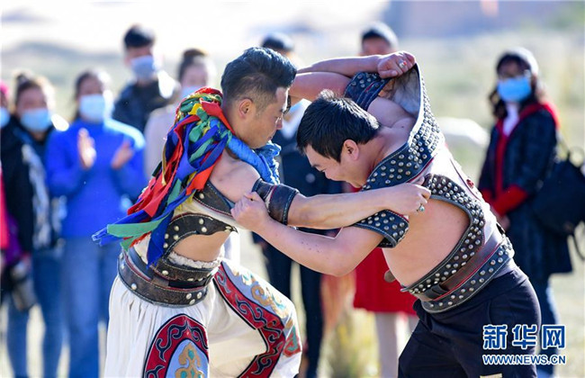 10月21日,一名游客(右)在阿拉善通湖草原旅游區(qū)民俗旅游項目中體驗搏克。新華社發(fā)(王正 攝)