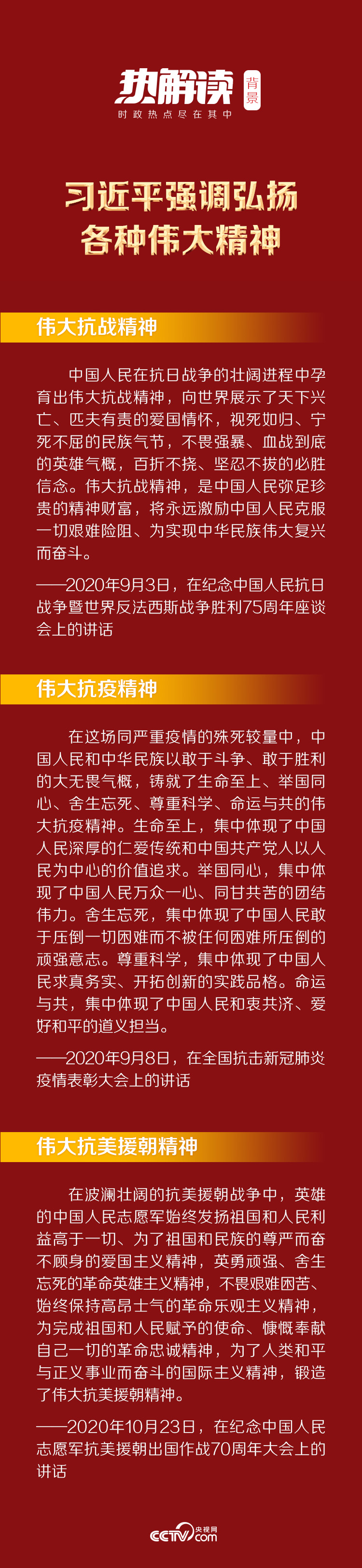 今年以來(lái),總書記多次詮釋各種精神:偉大抗戰(zhàn)精神、偉大抗疫精神、偉大抗美援朝精神……在歷史回響中,帶我們接受思想洗禮,汲取奮勇前行的精神力量。