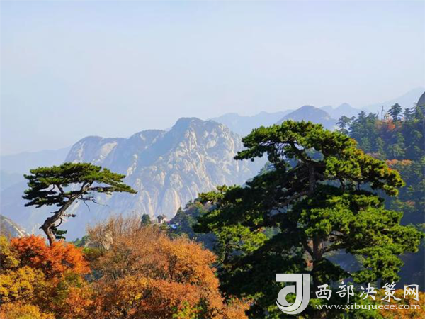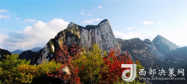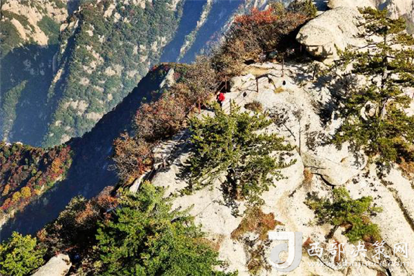 秋天的華山很是動人。天高云淡,漫山紅葉分外妖嬈,彩林賞心悅目,一步一景,滿目所見皆是驚喜。若是乘索道而上,層林金黃與郁郁蔥蔥的華山松、灰白的花崗巖山體相互迎映襯,形成了秋天多彩的西岳風(fēng)光。