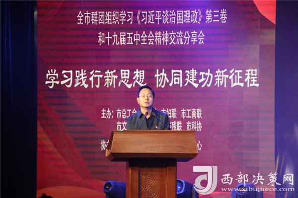 西部決策網(wǎng)訊 為深入貫徹習近平新時代中國特色社會主義思想,學習宣傳貫徹《習近平談治國理政》第三卷、黨的十九屆五中全會精神,加快群團協(xié)同化建設(shè)進程,11月5日,西寧市總工會牽頭召開市級群團組織“學習踐行新思想 協(xié)同建功新征程”為主題的學習《習近平談治國理政》第三卷和黨的十九屆五中全會精神交流分享會,市委常委、宣傳部部長、市總工會主席王霞出席會議并講話。全市各群團組織負責同志、勞模代表和干部職工群眾共300余人參加活動。