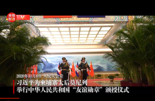 國家主席習近平6日在人民大會堂為柬埔寨太后莫尼列舉行中華人民共和國“友誼勛章”頒授儀式。