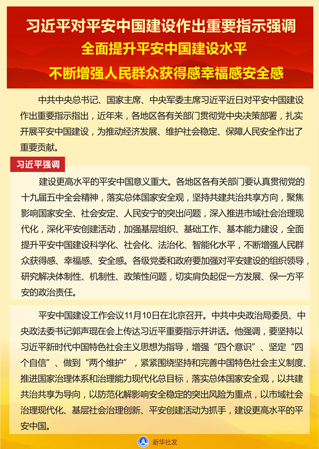 新華社北京11月11日電 中共中央總書記、國家主席、中央軍委主席習(xí)近平近日對平安中國建設(shè)作出重要指示指出,近年來,各地區(qū)各有關(guān)部門貫徹黨中央決策部署,扎實開展平安中國建設(shè),為推動經(jīng)濟(jì)發(fā)展、維護(hù)社會穩(wěn)定、保障人民安全作出了重要貢獻(xiàn)。