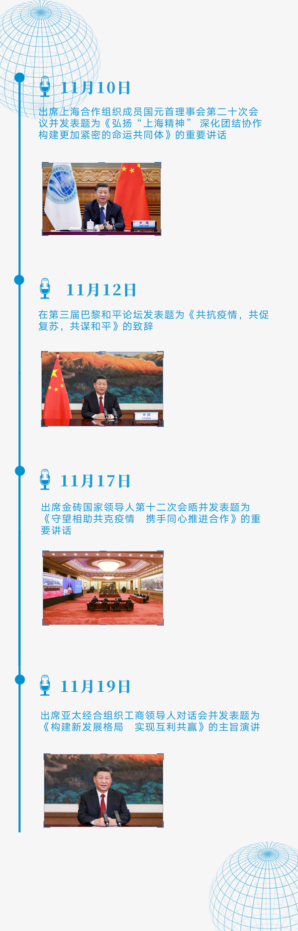 11月10日至22日,不到兩周時(shí)間,習(xí)主席以視頻方式出席4場多邊會(huì)議、一場國際論壇,發(fā)表8場重要講話、主旨演講和致辭,外交日程異常密集。