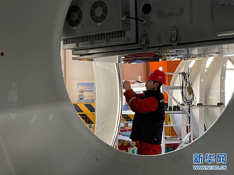 11月26日,在金風(fēng)風(fēng)電設(shè)備科技有限公司生產(chǎn)車間,工人在加工風(fēng)機(jī)組件。 新華社記者 安路蒙 攝