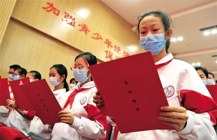 11月30日,陜西省2020年“憲法宣傳周”啟動儀式在西安舉行。全省13個市(區(qū))107個縣(區(qū))統(tǒng)一啟動實施。這是西安高新區(qū)第五小學(xué)探花嶺校區(qū)學(xué)生正在誦讀憲法。 記者 安濤 攝