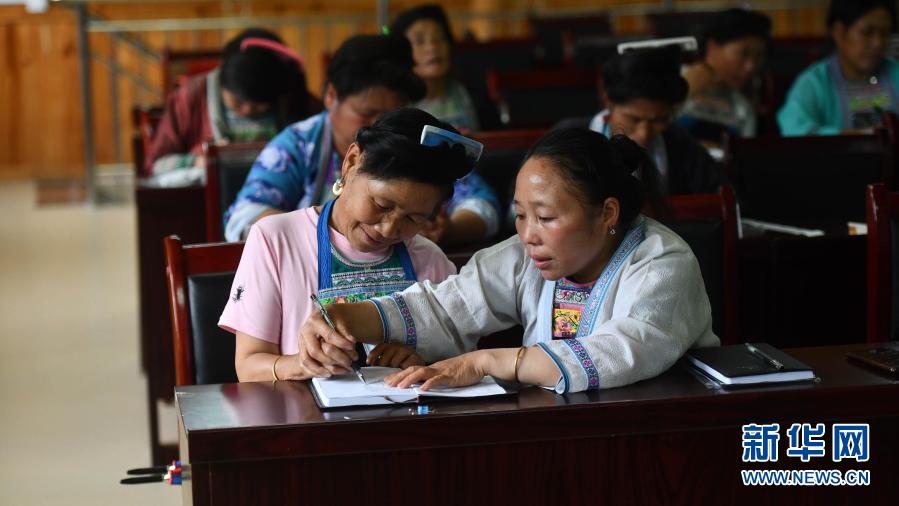 在烏英苗寨,黨鳩村村委會副主任梁秀平(右)在研究“雙語雙向”培訓班的課堂內(nèi)容(6月18日攝)。新華社記者 黃孝邦 攝