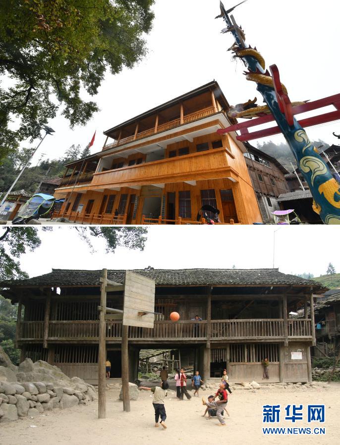 這是一張拼版照片,上圖為:2019年3月20日拍攝的烏英苗寨(無人機照片,新華社記者黃孝邦攝);下圖為:2008年9月7日拍攝的烏英苗寨(資料照片)。新華社發(fā)
