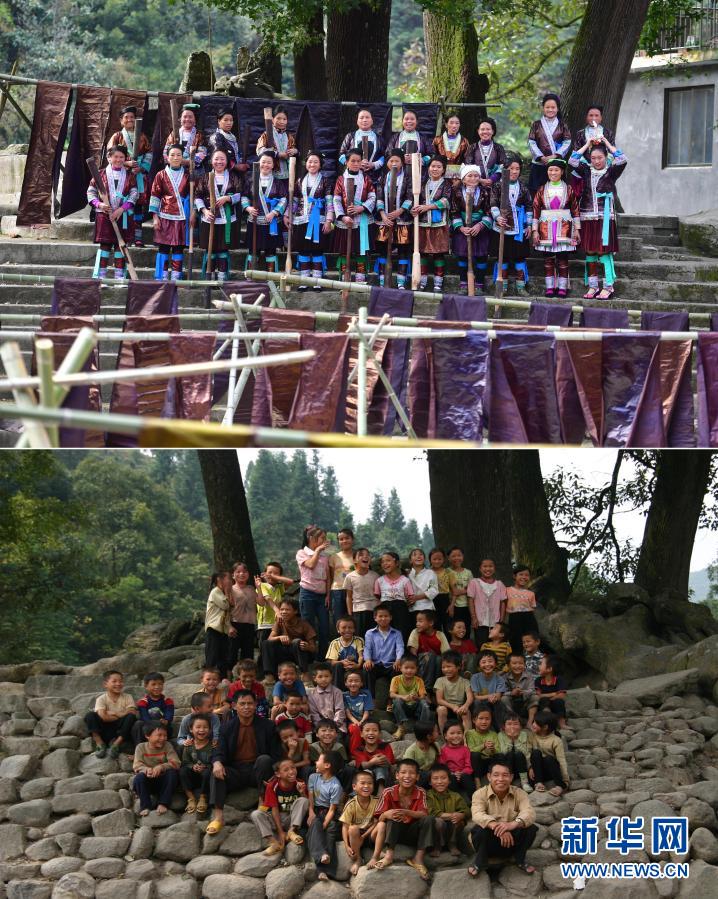 這是一張拼版照片,上圖為:2020年10月25日,烏英苗寨“雙語雙向”培訓班的同學們在古樹下合影(新華社記者黃孝邦攝);下圖為:2006年9月19日,烏英苗寨教學點的師生們在古樹下合影(龍濤攝)。新華社發(fā)
