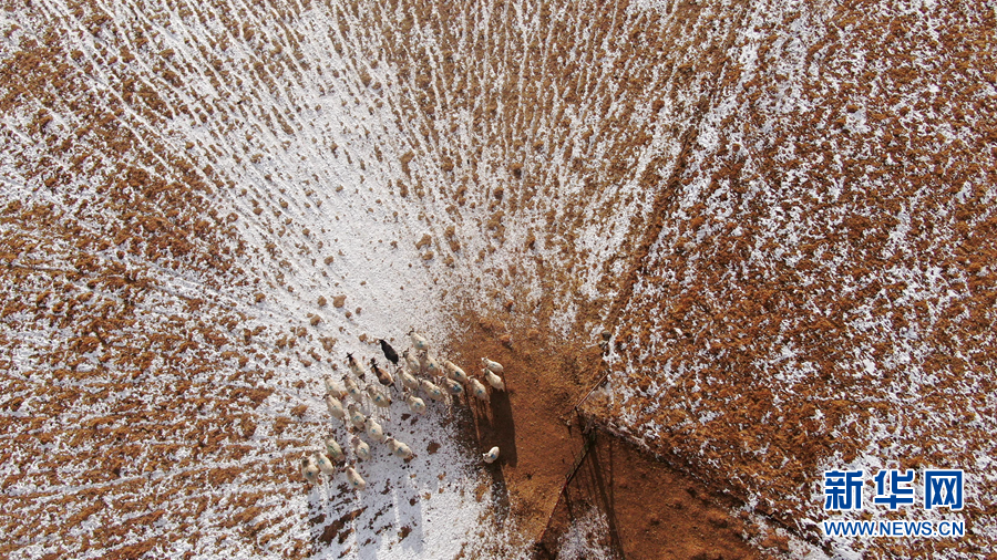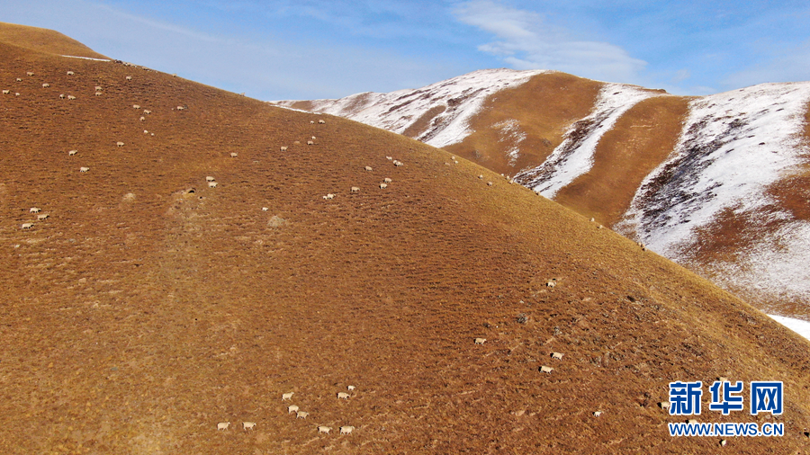 12月6日,羊群在雪后的阿柔草原上活動(dòng)(無人機(jī)照片)。新華社記者 張宏祥 攝