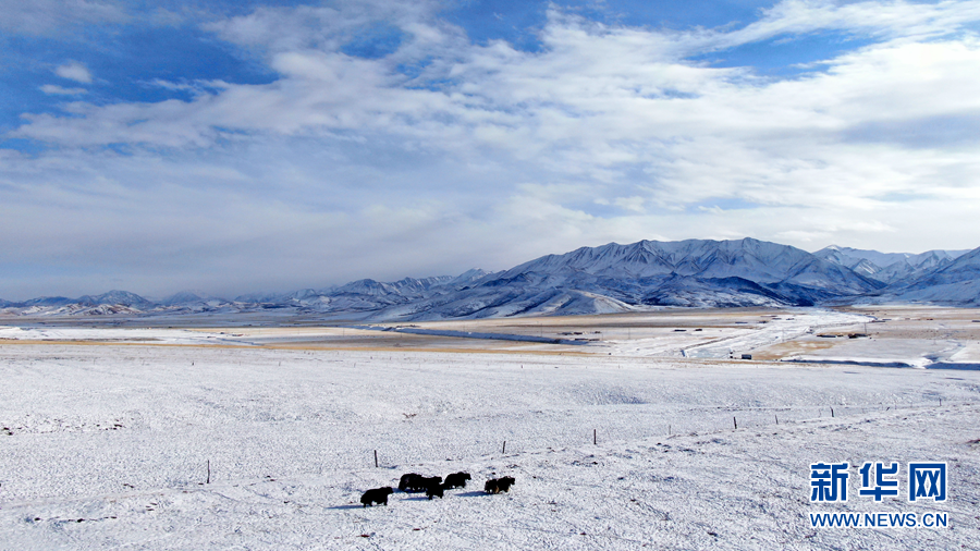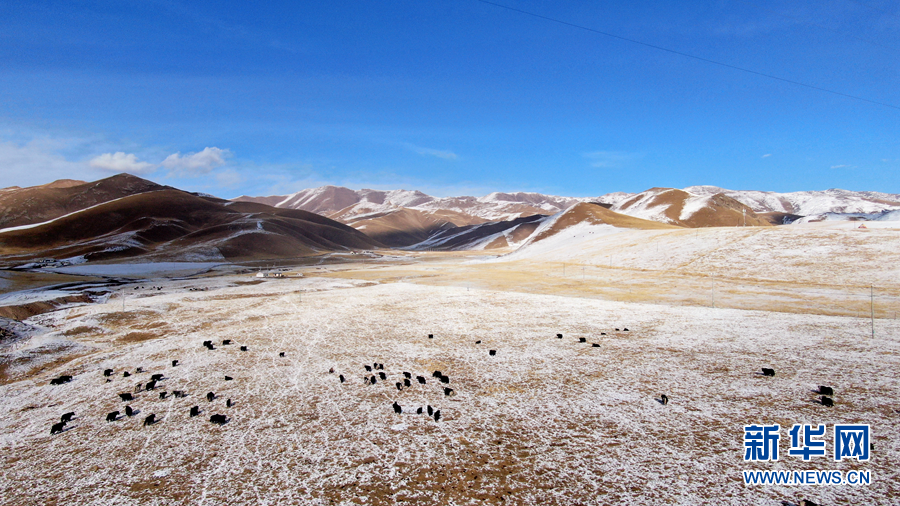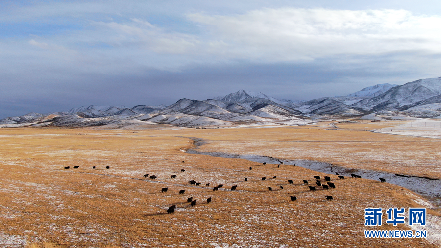 12月6日,牦牛在雪后的阿柔草原上活動(dòng)(無人機(jī)照片)。新華社記者 張宏祥 攝