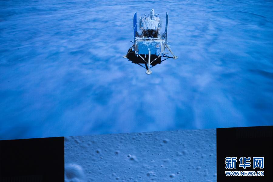 2020年12月1日23時11分,嫦娥五號探測器成功著陸在月球正面西經(jīng)51.8度、北緯43.1度附近的預(yù)選著陸區(qū),并傳回著陸影像圖。這是在北京航天飛行控制中心拍攝的嫦娥五號探測器落月瞬間。新華社記者 金立旺 攝