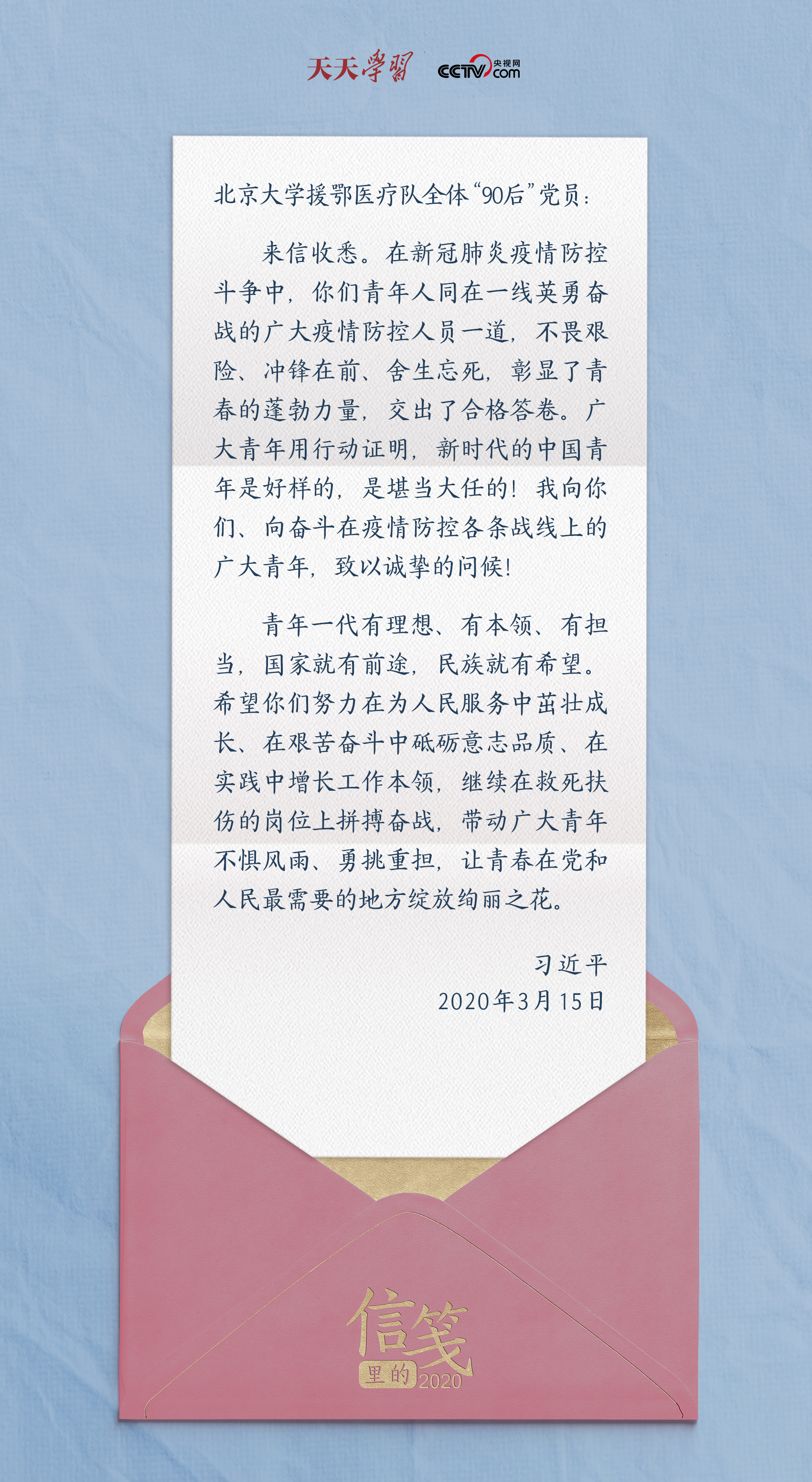 2020年3月15日,北京大學援鄂醫(yī)療隊全體“90后”黨員收到了總書記的回信?;匦胖校倳浢銊钏麄冏屒啻涸邳h和人民最需要的地方綻放絢麗之花。