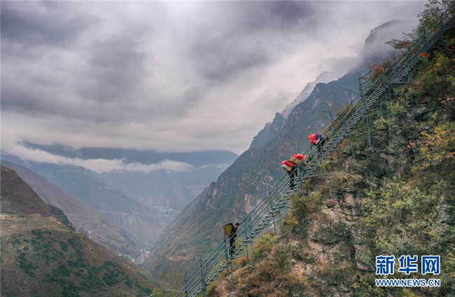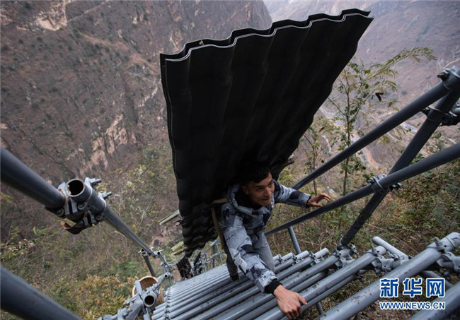 12月23日,某色蘇不惹(中)和同伴在鋼梯上休息,他們正通過(guò)鋼梯把修民宿的建材往村里背。新華社記者 江宏景 攝