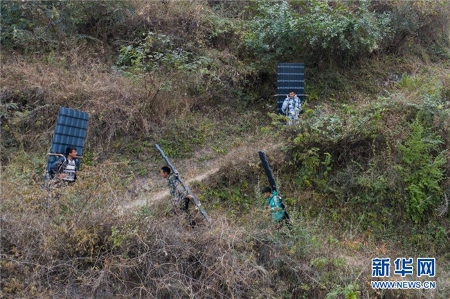 某色蘇不惹(右二)和同伴背著“雙十一”采購(gòu)的貨物回村(2019年11月16日攝,無(wú)人機(jī)照片)。新華社記者 江宏景 攝