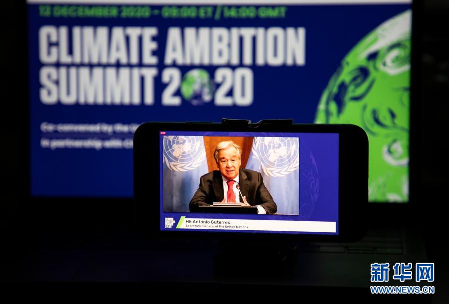 這是2020年12月12日在美國紐約拍攝的聯(lián)合國秘書長古特雷斯在氣候雄心峰會(huì)上通過視頻發(fā)表講話的屏幕畫面。氣候雄心峰會(huì)由聯(lián)合國及有關(guān)國家倡議舉辦,旨在紀(jì)念《巴黎協(xié)定》達(dá)成五周年,進(jìn)一步動(dòng)員國際社會(huì)強(qiáng)化氣候行動(dòng),推進(jìn)多邊進(jìn)程。新華社記者 王迎 攝