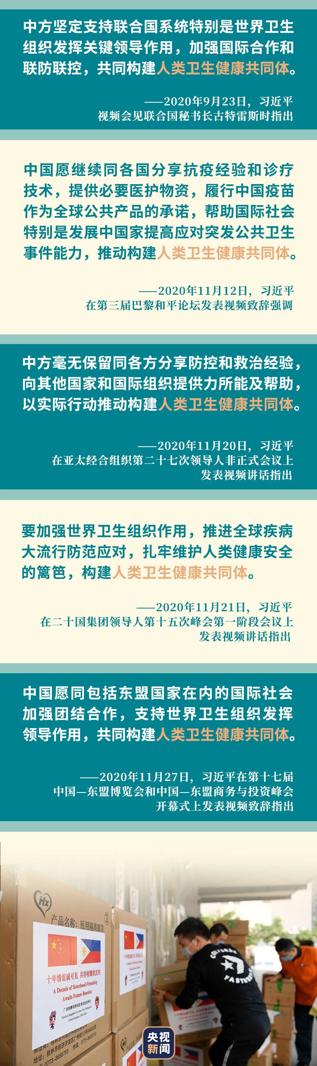 疫情發(fā)生以來,中國積極履行國際義務(wù),密切同世界衛(wèi)生組織和相關(guān)國家的友好合作,主動(dòng)同國際社會(huì)分享疫情和病毒信息、抗疫經(jīng)驗(yàn)做法。向150多個(gè)國家和10個(gè)國際組織提供抗疫援助,向34個(gè)國家派出36支醫(yī)療專家組,向各國提供2200多億只口罩、22.5億件防護(hù)服、10.2億份檢測(cè)試劑盒,加入“新冠肺炎疫苗實(shí)施計(jì)劃”,承諾將疫苗作為全球公共產(chǎn)品……中國履行國際義務(wù),發(fā)揮全球抗疫物資最大供應(yīng)國作用,共同構(gòu)建人類衛(wèi)生健康共同體。