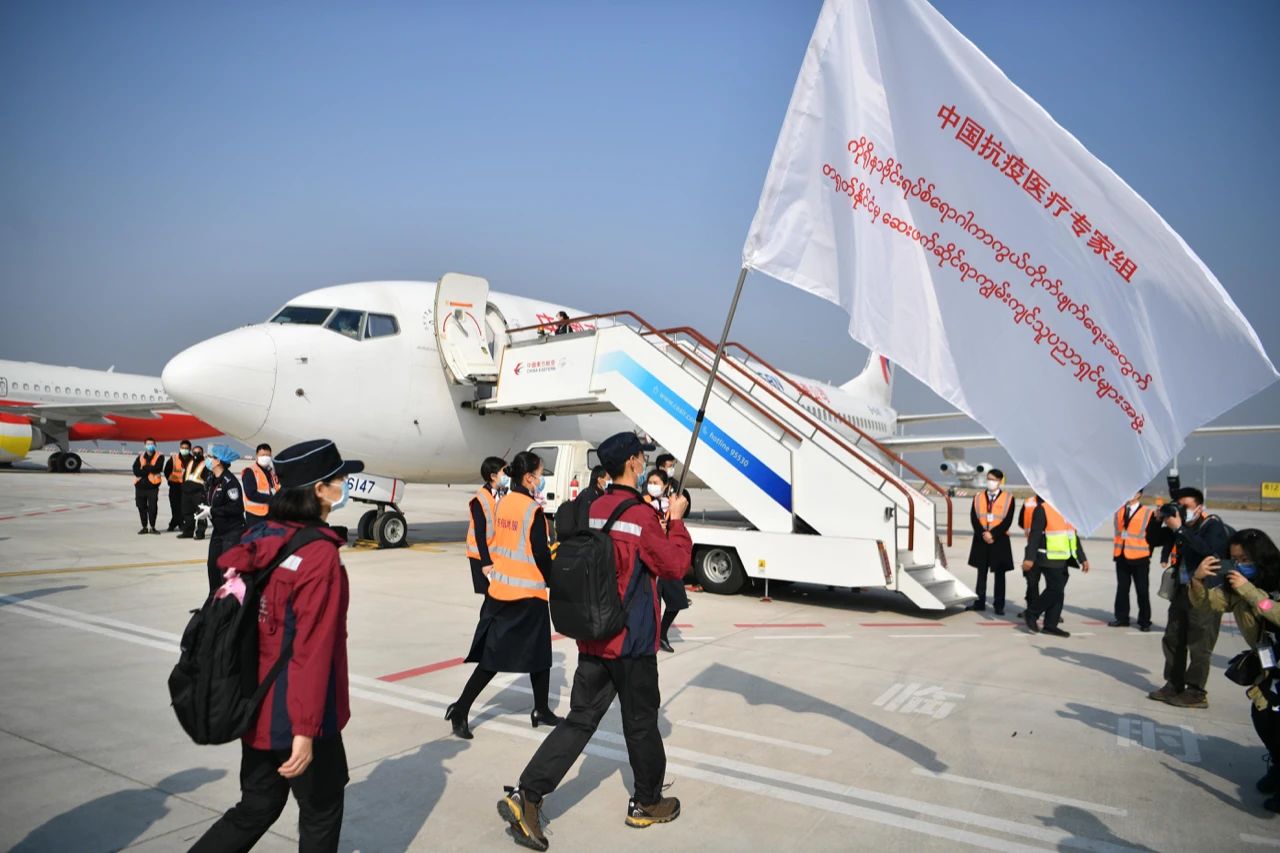 △2020年4月8日,應(yīng)緬甸政府邀請(qǐng),中國赴緬甸抗疫醫(yī)療專家組從云南昆明出發(fā),赴緬甸協(xié)助當(dāng)?shù)刈龊靡咔榉揽毓ぷ鳌?/p>