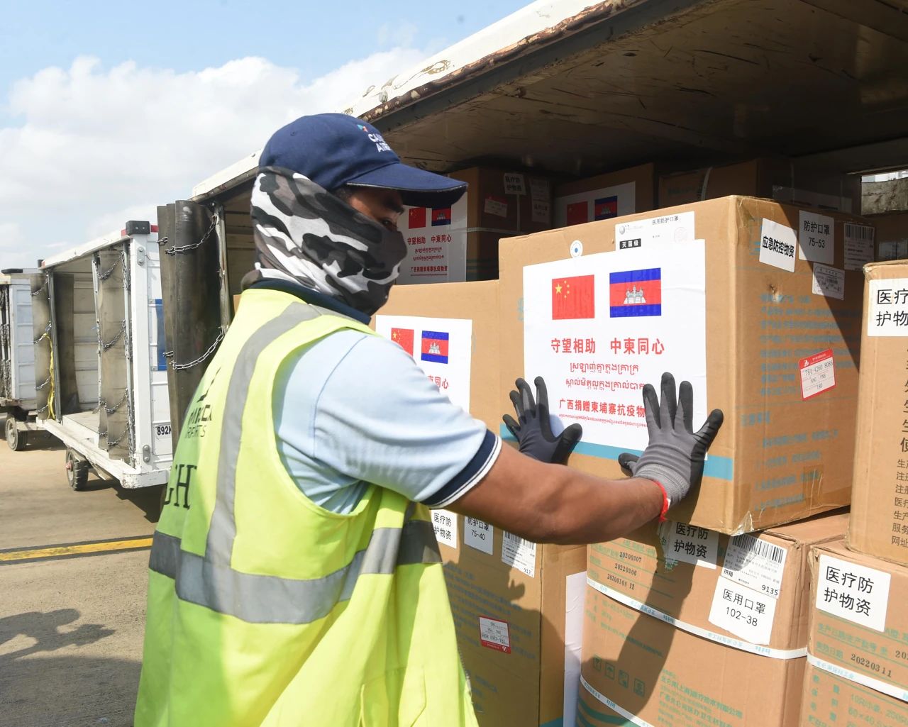 △2020年3月23日,一架搭載7名來自廣西壯族自治區(qū)醫(yī)療專家和一批防疫醫(yī)療物資的中國南航包機(jī)降落在柬埔寨首都金邊國際機(jī)場(chǎng)。