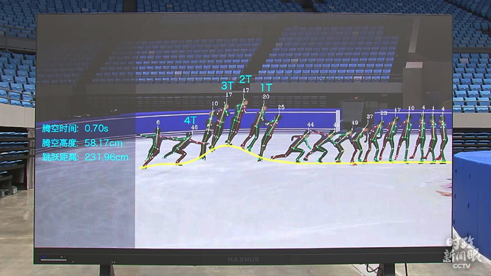 △花樣滑冰隊(duì)借助回看實(shí)時(shí)錄像方式,了解隊(duì)員騰空時(shí)間、高度和跳躍距離,提高備戰(zhàn)效果。(總臺(tái)央視記者鐘銳拍攝)
