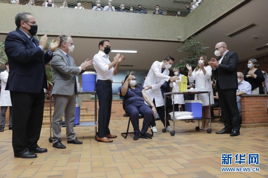 2021年1月18日,巴西圣保羅州坎皮納斯市首名接種者、49歲的女護士利亞娜·蒂諾科(中)在接種中國新冠疫苗。新華社發(fā)(圣保羅州政府供圖)