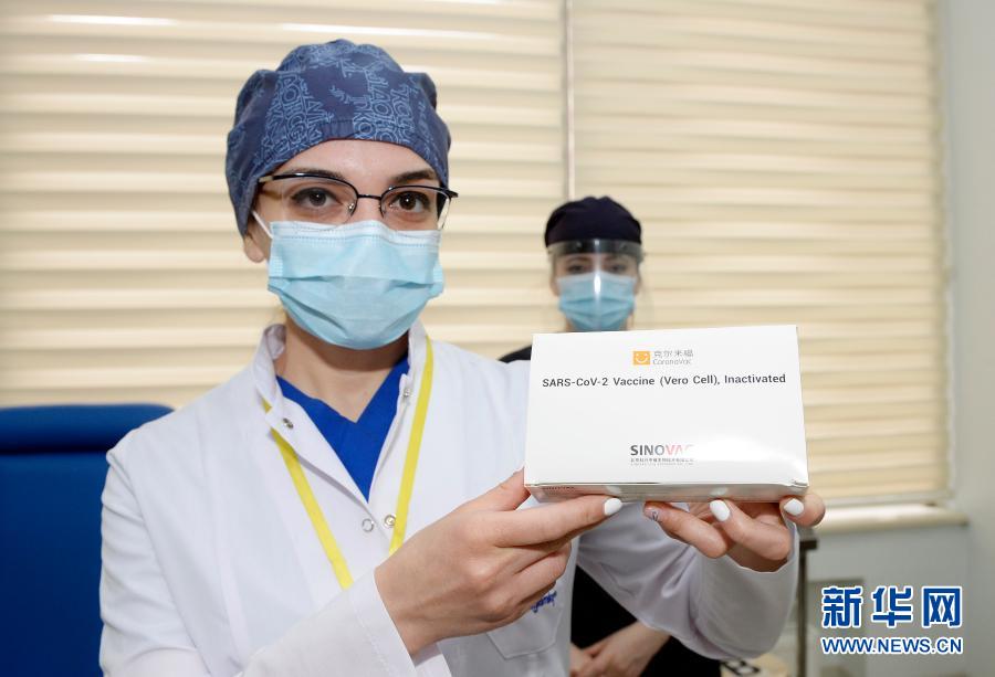 2021年1月18日,在阿塞拜疆首都巴庫,一名醫(yī)務(wù)人員展示中國科興公司生產(chǎn)的新冠疫苗。新華社發(fā)(巴巴耶夫攝)