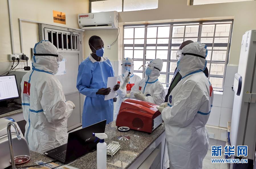 2020年8月21日,在南蘇丹首都朱巴的一處新冠病毒檢測機構(gòu),中國抗疫醫(yī)療專家組成員與南一線醫(yī)護人員交流。新華社發(fā)(中國駐南蘇丹大使館供圖)