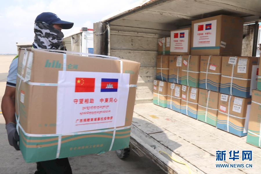 2020年3月23日,在柬埔寨首都金邊,機場工作人員搬運中國援柬醫(yī)療物資。新華社記者 毛鵬飛 攝