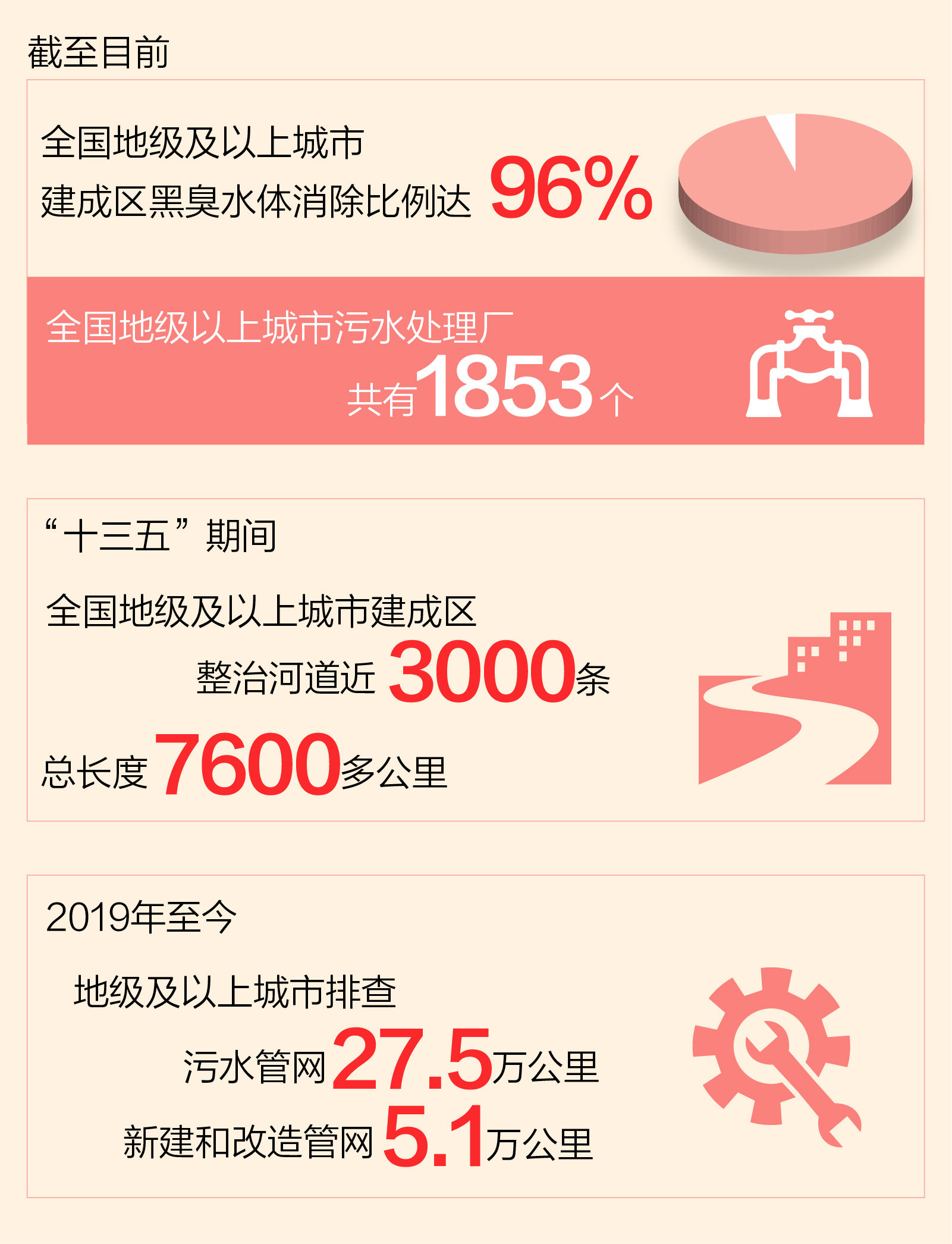 “十三五”期間,全國地級及以上城市建成區(qū)整治河道近3000條,總長度7600多公里。截至目前,全國地級及以上城市建成區(qū)黑臭水體消除比例達(dá)96%。2019年至今,全國地級及以上城市排查污水管網(wǎng)27.5萬公里,新建和改造管網(wǎng)5.1萬公里。