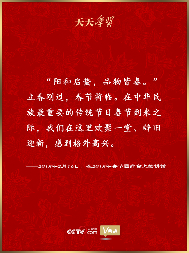 黨的十八大以來,習(xí)近平總書記多次在臘月二十九舉行的春節(jié)團拜會上發(fā)表重要講話,盤點舊歲、謀劃新年,向全國各族人民、港澳臺同胞和海外僑胞拜年,并致以美好的新春祝福。在講話中,習(xí)近平總書記頻頻引用具有新春節(jié)令特點的古代經(jīng)典詩文名句抒發(fā)情懷、暢想未來。這些詩文名句如春風(fēng)化雨潤人心田、暖人心扉,激勵著億萬人民在新的一年里追夢前行。