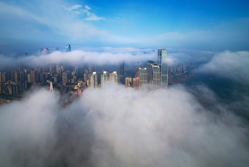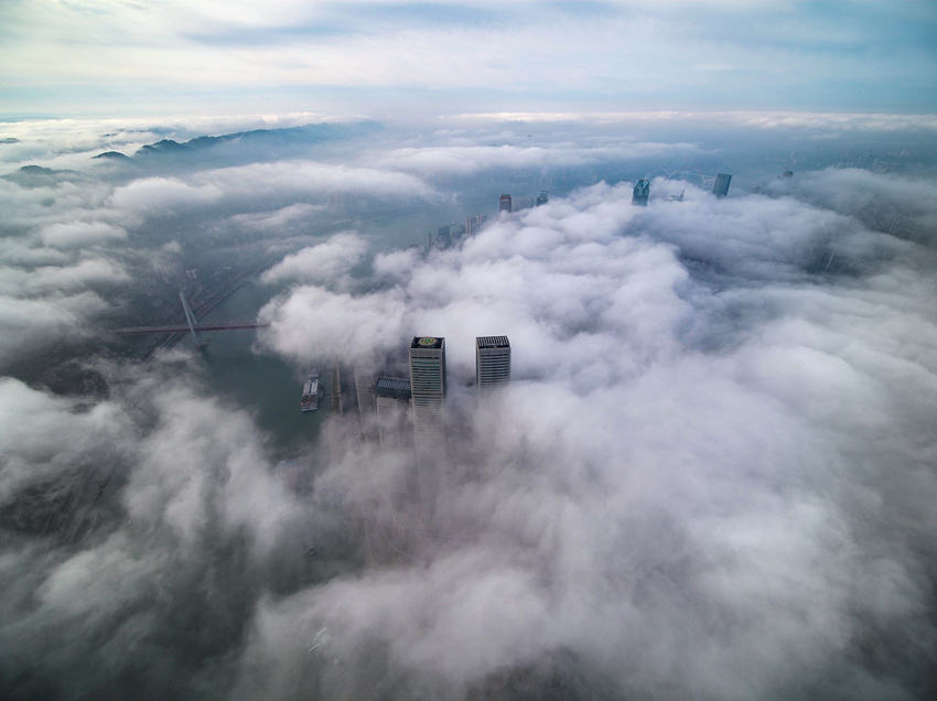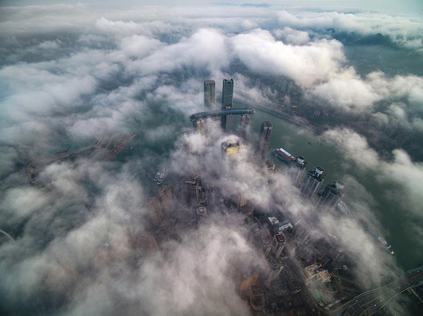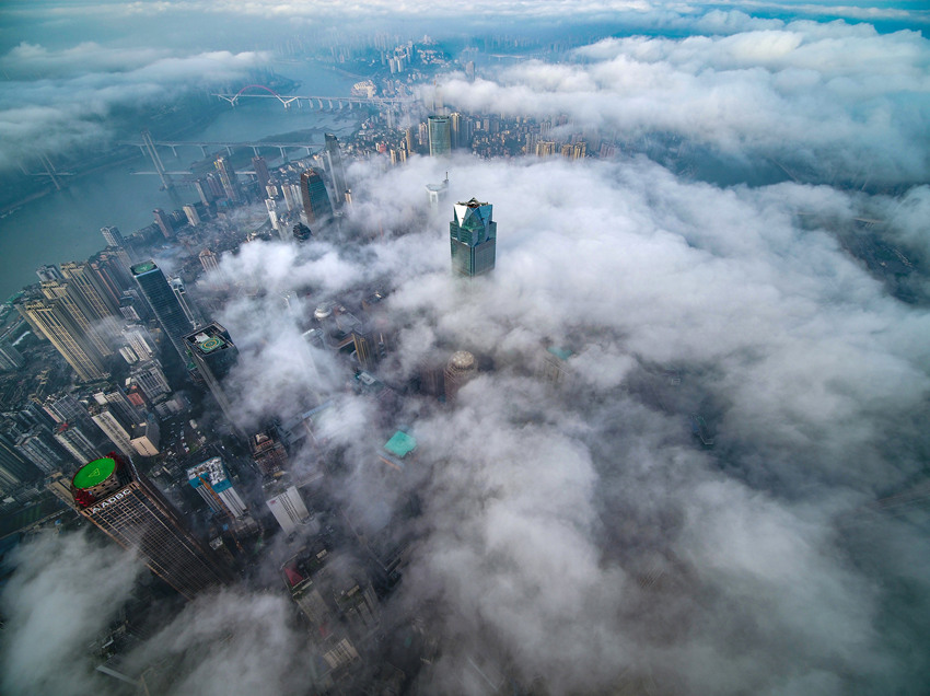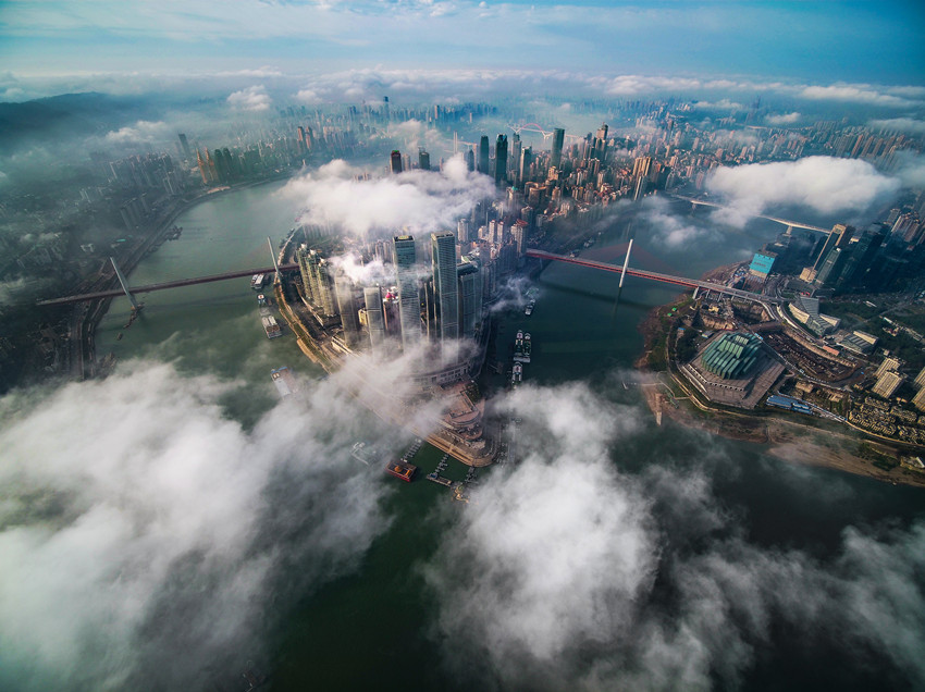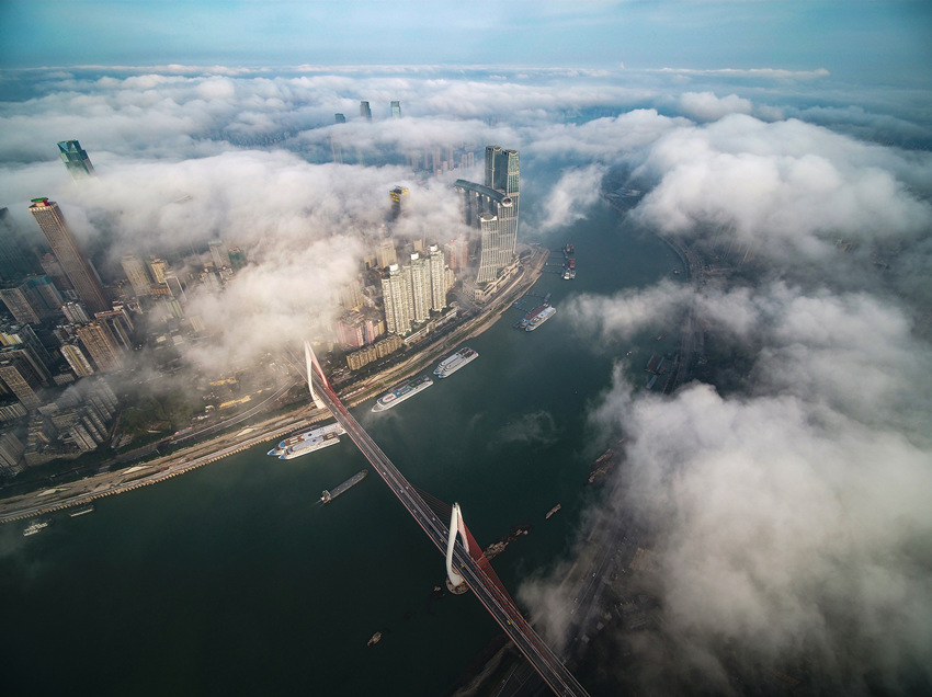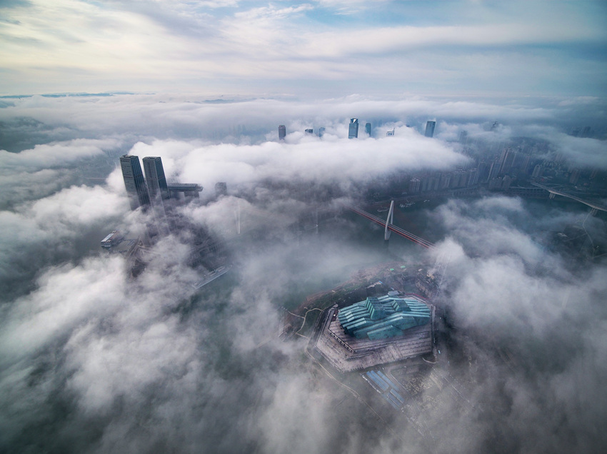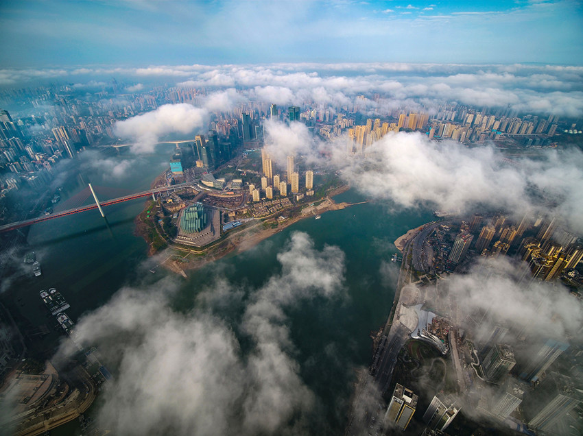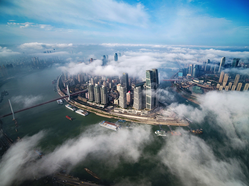 航拍重慶城區(qū),云霧繚繞宛如仙境。王正坤攝