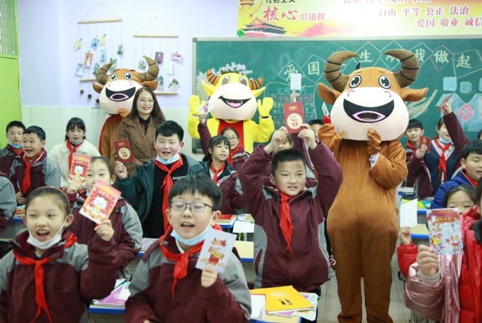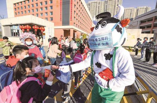 2月21日,南京市江寧開(kāi)發(fā)區(qū)學(xué)校一老師打扮成“福氣牛”,在校園門口為孩子們送上裝有口罩、新年祝福和防疫小貼士的“紅包”。邵丹 攝