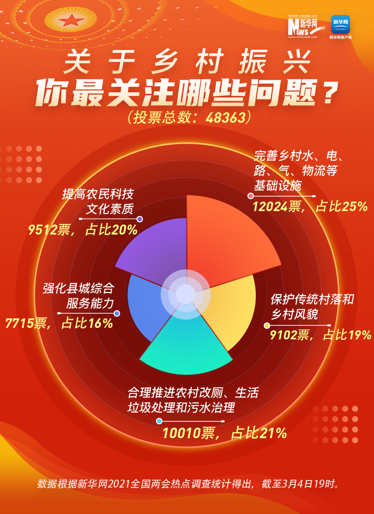 其中,“完善鄉(xiāng)村水、電、路、氣、物流等基礎(chǔ)設(shè)施”、“合理推進(jìn)農(nóng)村改廁、生活垃圾處理和污水治理”、“提高農(nóng)民科技文化素質(zhì)”位列子選項(xiàng)前三位,成為大家關(guān)注的焦點(diǎn)。如何推進(jìn)更多、更具體的鄉(xiāng)村振興支持政策,如何突破戶(hù)籍制度等領(lǐng)域改革,如何完善城鄉(xiāng)一體化發(fā)展的體制機(jī)制、推動(dòng)農(nóng)業(yè)農(nóng)村現(xiàn)代化邁好“十四五”第一步,成為代表委員的重要關(guān)切。
