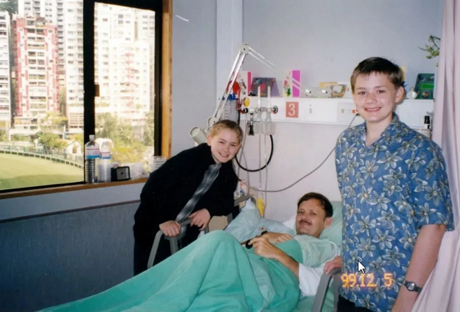 1999年潘維廉在香港一家醫(yī)院接受癌癥手術(shù),和家人在一起。(圖源:人民日報(bào)客戶端)