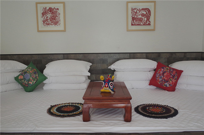 “大到喝茶的桌椅,小到墻上的剪紙,都是找專門手藝人做的。”小雅指著“炕”上的花坐墊說,這也是拿小孩不穿的布帛縫起來的,展現陜北特色的“百家衣”風格。陜北炕比較冰冷,她們就用木頭把炕包起來,再鋪上軟墊。