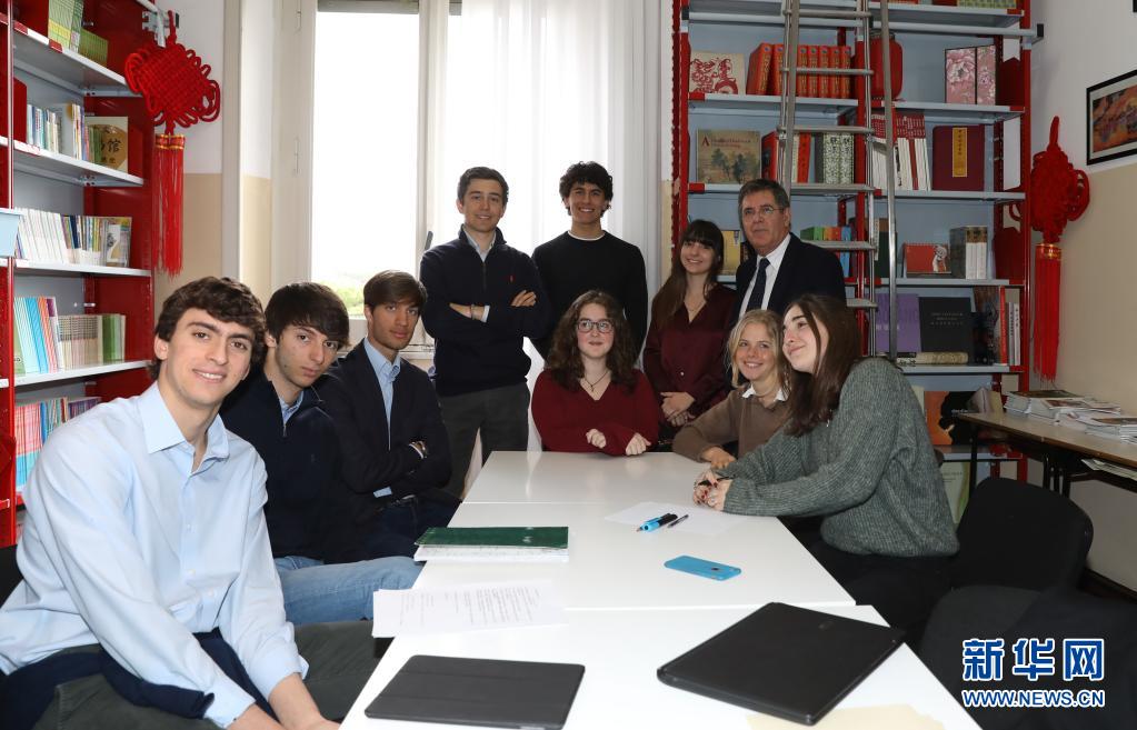 意大利羅馬國立住讀學(xué)校校長雷亞萊(后排右一)與致信習(xí)近平主席的學(xué)生們?cè)谝黄穑?019年3月18日攝)。新華社記者 程婷婷 攝