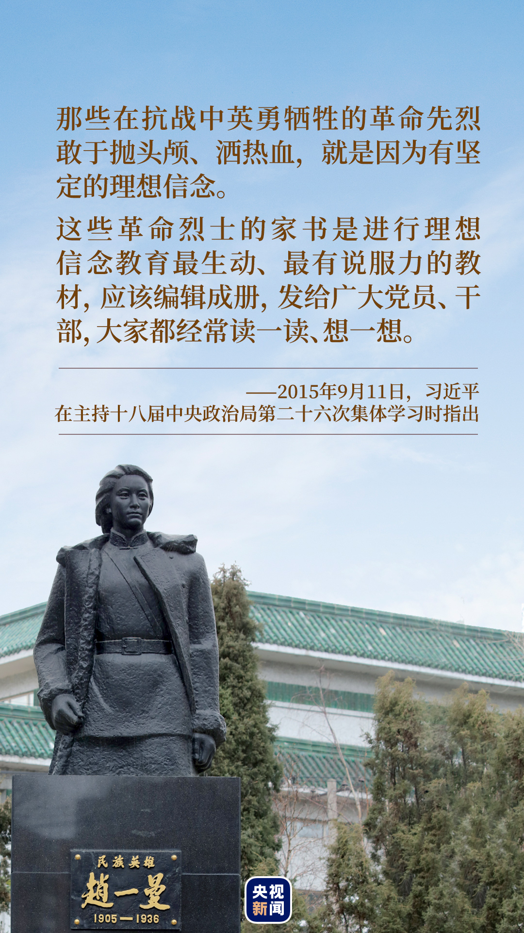 “趙一曼在臨死前的遺書中寫道:‘母親因為堅決地做了反滿抗日的斗爭,今天已經到了犧牲的前夕了。母親和你在生前是永久沒有再見的機會了……我最親愛的孩子?。∧赣H不用千言萬語來教育你,就用實行來教育你。在你長大成人之后,希望你不要忘記你的母親是為國而犧牲的……母親死后,我的孩子要代替母親繼續(xù)斗爭,自己壯大成長,來安慰九泉之下的母親!’”一字一句,總書記飽含深情。