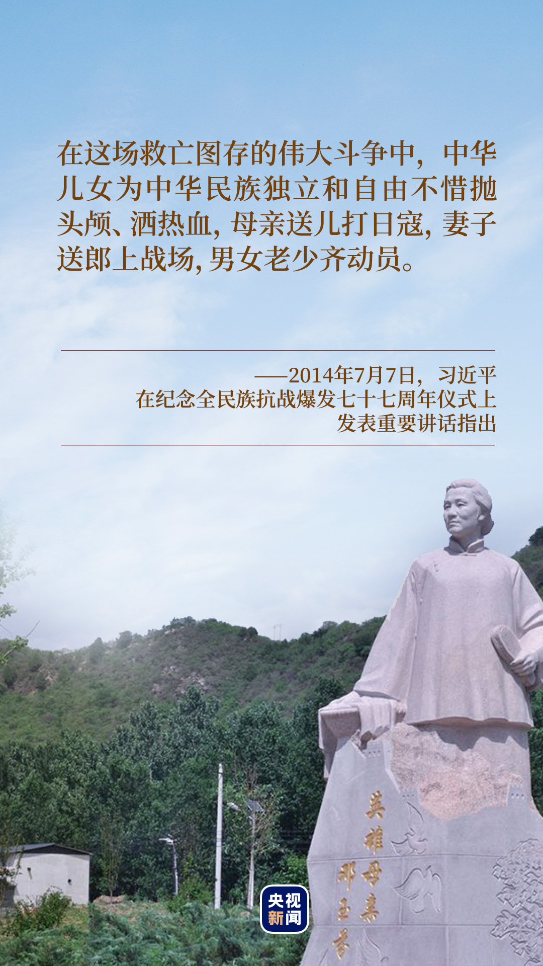 “北京密云縣一位名叫鄧玉芬的母親,把丈夫和5個孩子送上前線,他們全部戰(zhàn)死沙場。”2014年7月7日,在出席紀念全民族抗戰(zhàn)爆發(fā)七十七周年儀式并發(fā)表重要講話時,習近平總書記講述了英雄母親鄧玉芬的故事。