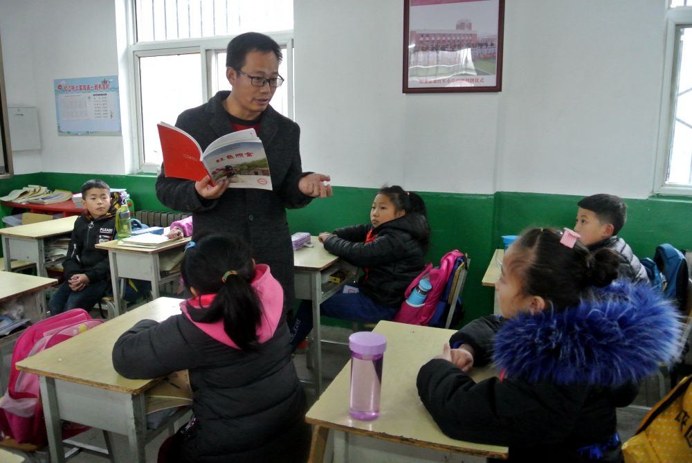 陜西省銅川市照金北梁紅軍小學(xué)副校長陶建剛給孩子們講《紅色照金》(2018年12月4日攝)。新華社記者 梁愛平 攝