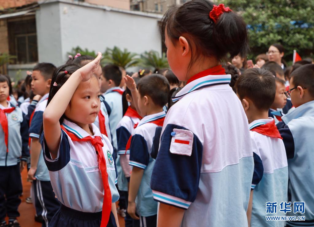 5月31日,新入隊(duì)的少先隊(duì)員在入隊(duì)儀式上向高年級(jí)少先隊(duì)員敬禮。新華社記者 劉續(xù) 攝