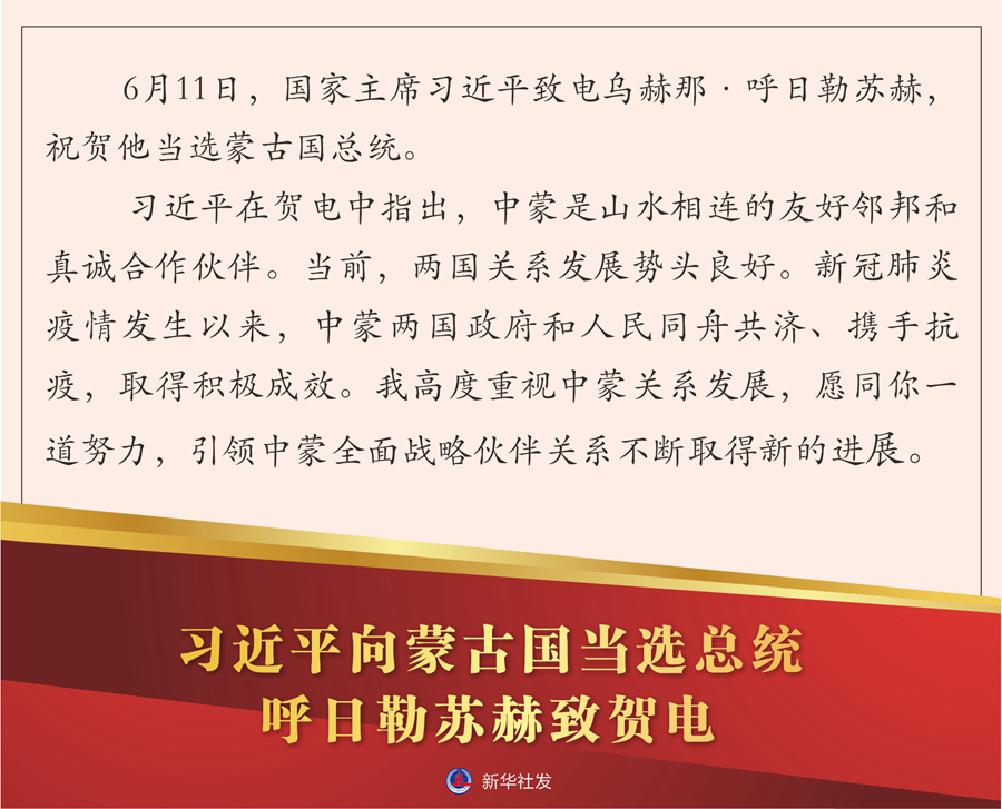 新華社北京6月11日電 6月11日,國家主席習(xí)近平致電烏赫那·呼日勒蘇赫,祝賀他當(dāng)選蒙古國總統(tǒng)。
