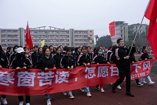 3月9日,高考誓師大會(huì)現(xiàn)場(chǎng),我們班的學(xué)生舉著橫幅和班旗,列隊(duì)準(zhǔn)備走過(guò)主席臺(tái)。橫幅上寫著“同是寒窗苦讀,怎愿甘拜下風(fēng)”。
