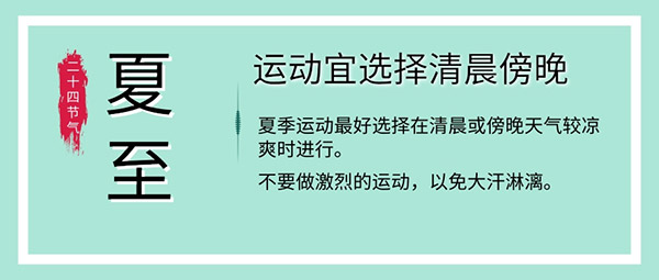夏季運動時間宜在清晨或傍晚,此時天氣涼爽,可以采用健步走、慢跑、太極拳等運動緩和的項目進(jìn)行體育鍛煉,宜避開烈日熾熱之時且不宜做過分劇烈的活動,以免汗出太過,損傷陽氣,耗傷陰氣,且運動后不可用冷水淋浴或沖頭。